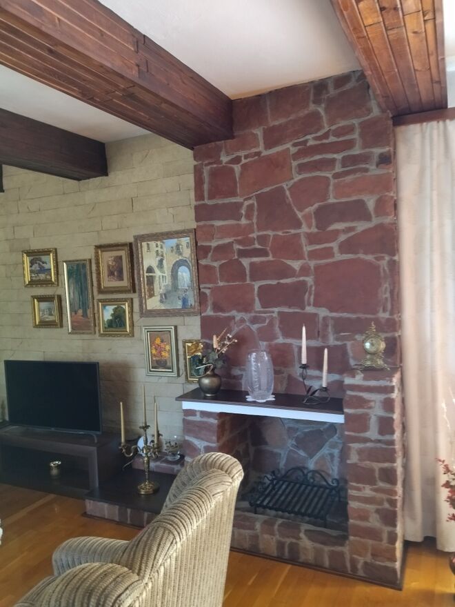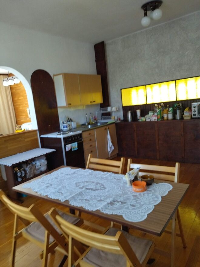 - parter: hol, toaleta, salon z kominkiem wykonanym z czerwonego pisakowca, jadalnia połączona z kuchnią,