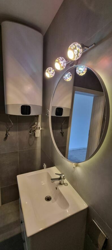 łazienka: kabina prysznicowa, bojler, szafka z umywalką - łazienka wykafelkowana